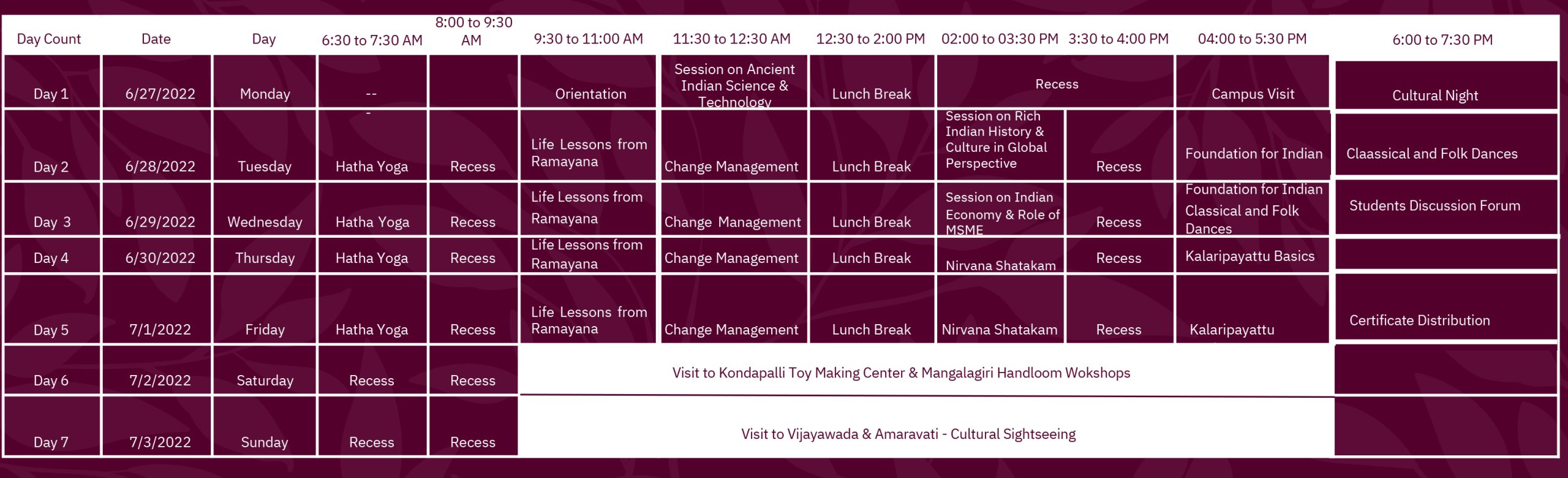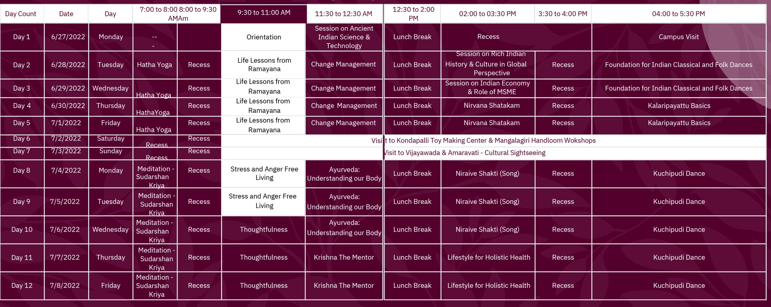The programme is tailor-made for the benefit of international students to experience the southern part of India by learning from culture & heritage, lectures, visiting industries, local sightseeing, and excursion to beautiful tourist places in India. It offers an opportunity for students who wish to experience India's rich diversity and cultural heritage.