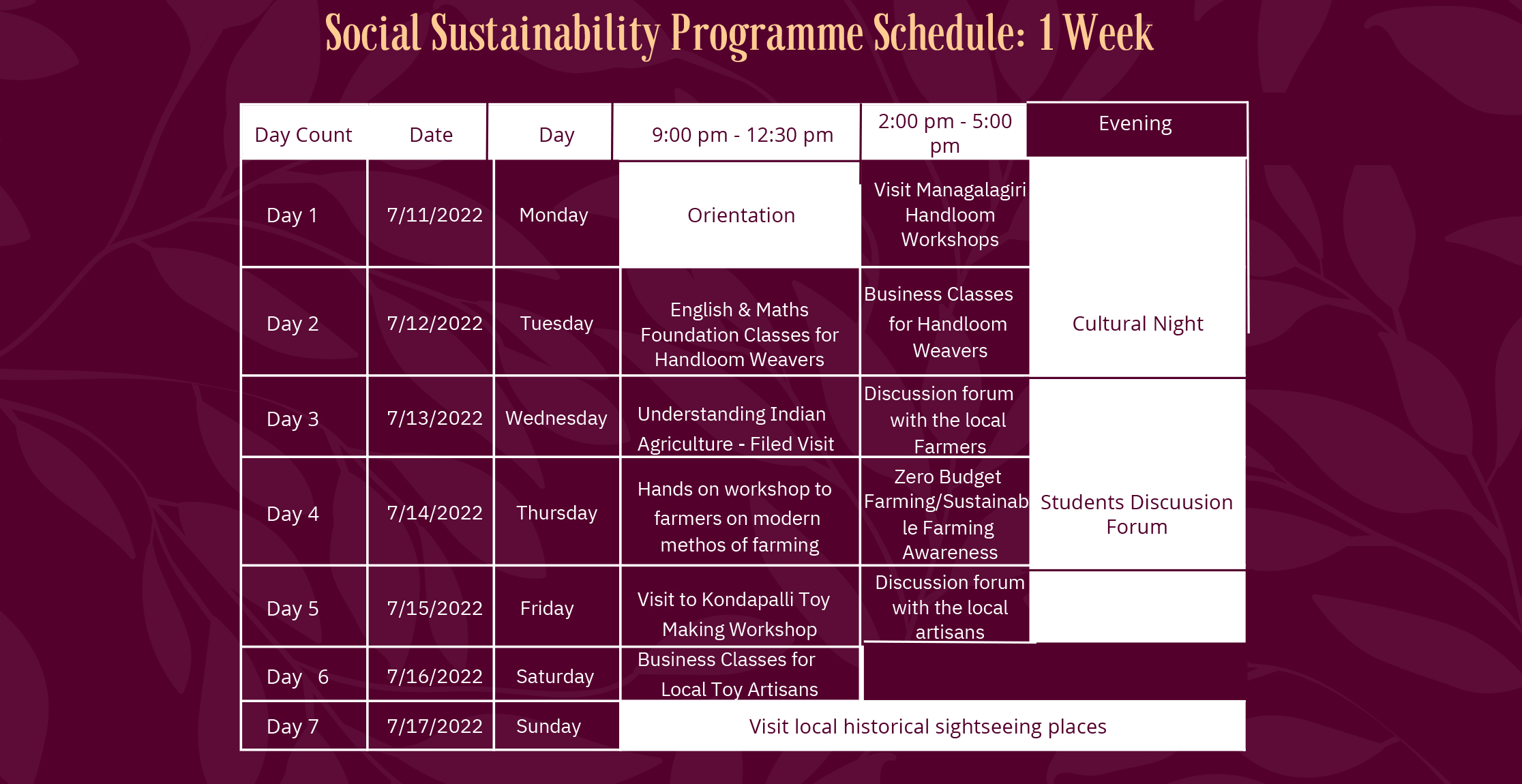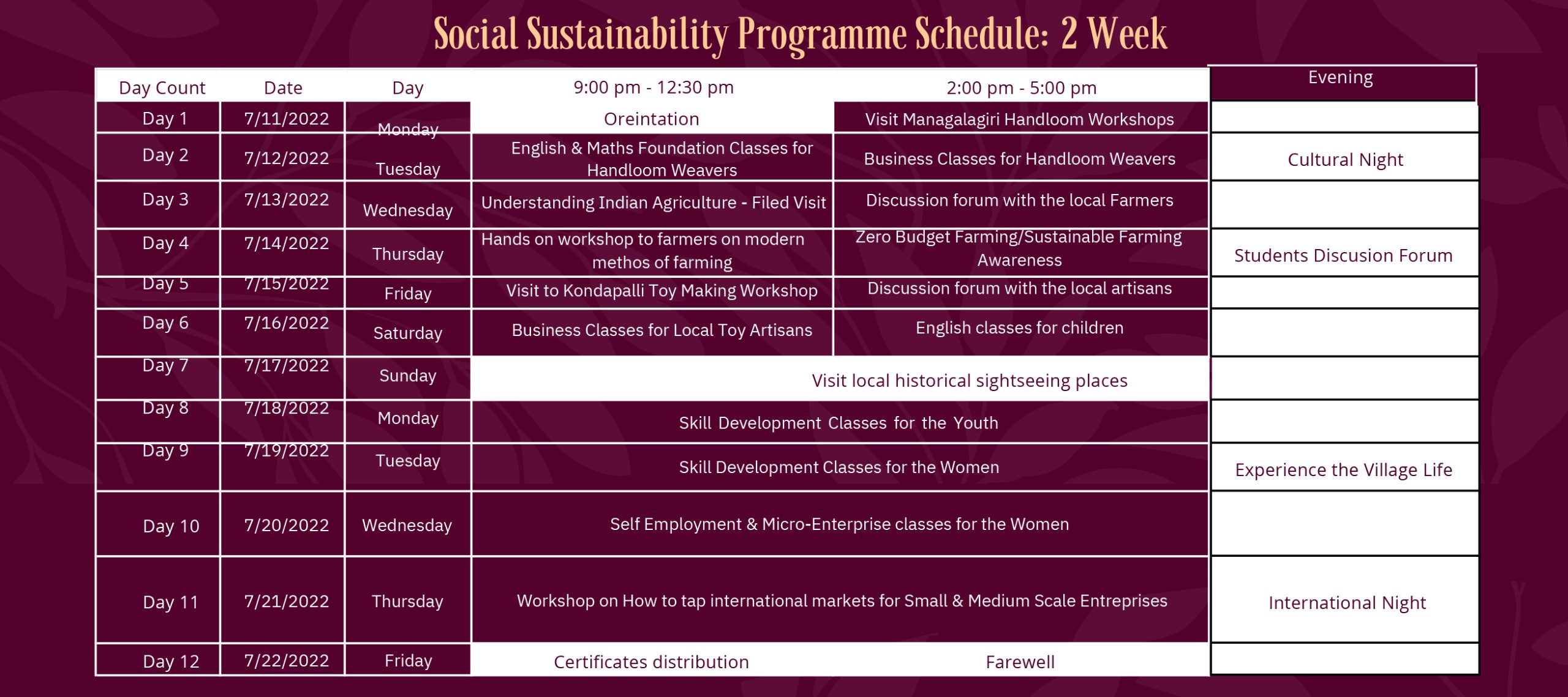 Social Sustainability Programme: 1 Week - (11th July to 17th July 2022); 2 Week - (11th July to 22nd July 2022)