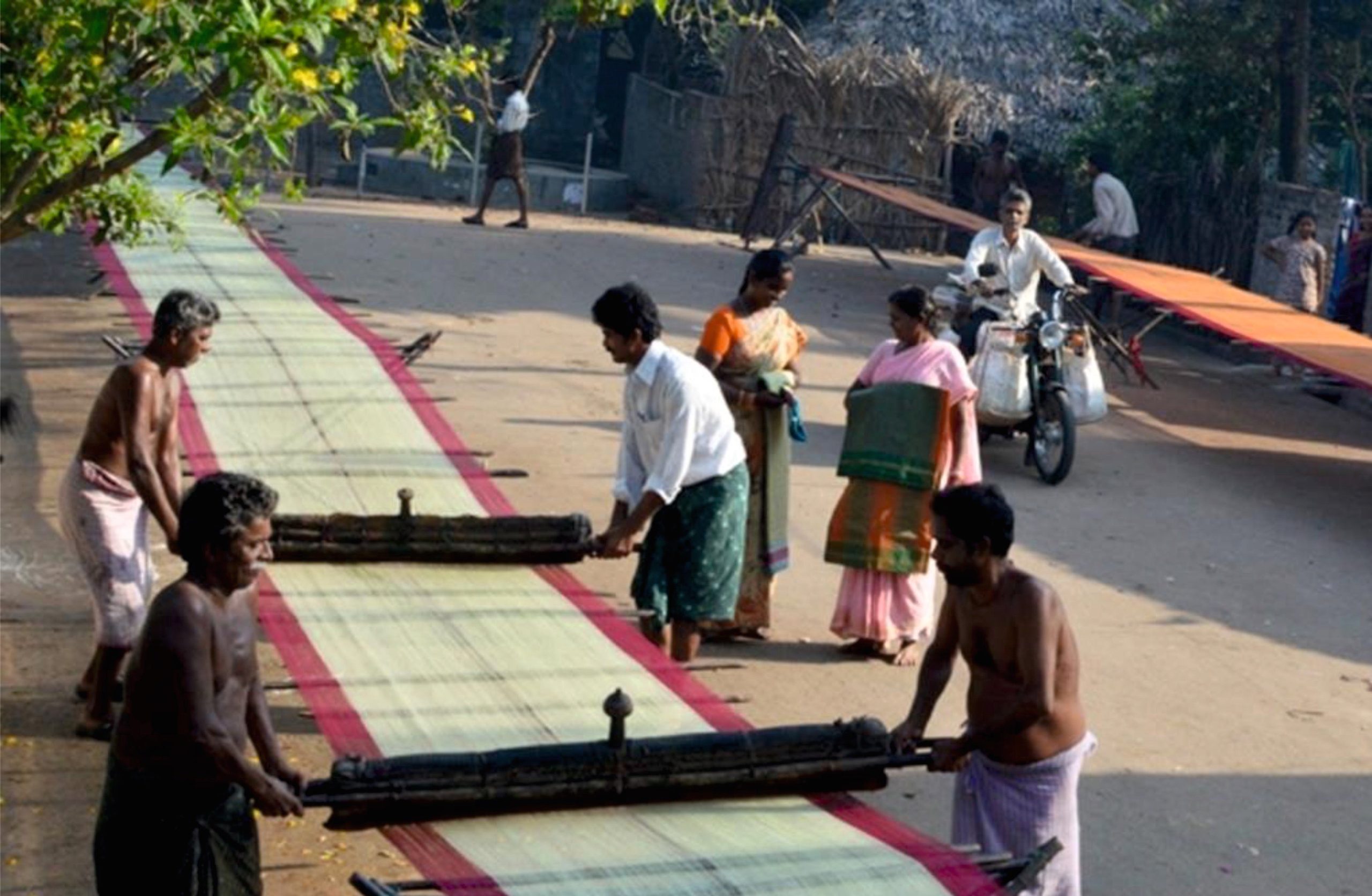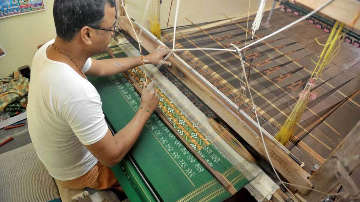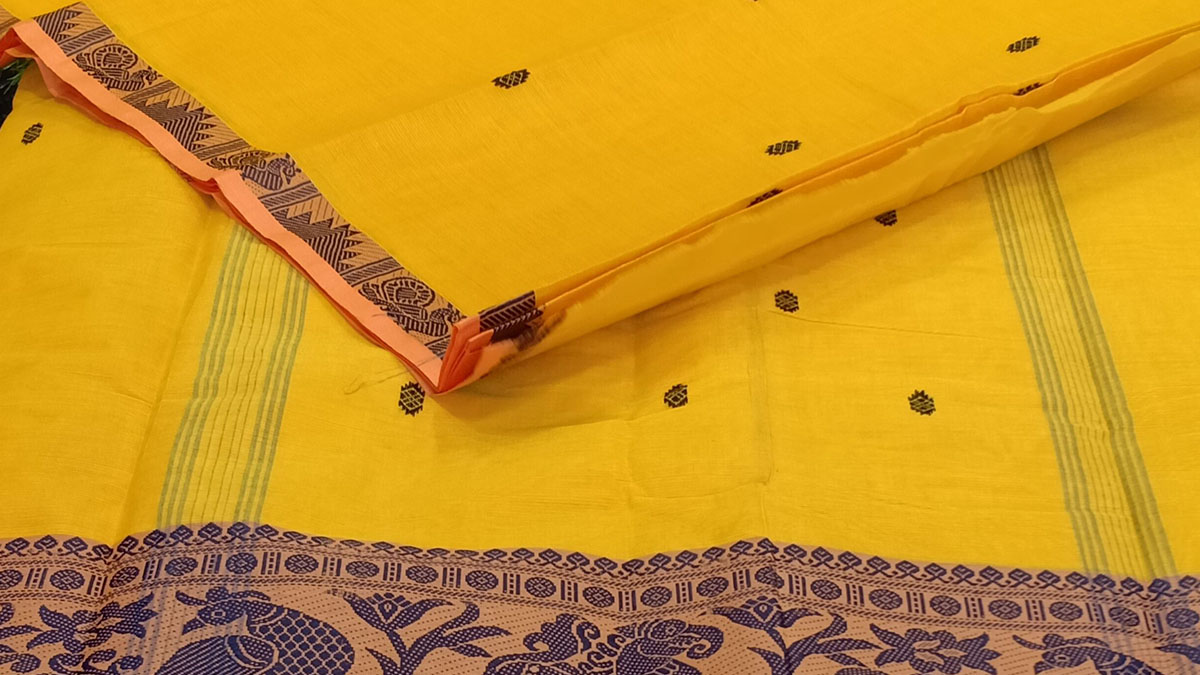 Managalagiri, the temple town, and pride of Andhra Pradesh, India, is generally known for its fine handloom sarees, mostly in cotton, cotton-silk, or mercerized cotton. There is a marked use of bright golden and sometimes inclusion of shining silvery grey zari. Being a town known for its temples, the auspicious temple design always figures someplace, most times along the saree's border.