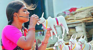 The Kondapalli toys are made from softwood known as Tella Poniki, found in nearby Kondapalli Hills. Each part is carved out separately. Then makku- a paste of tamarind seed powder & sawdust is used to join pieces together, add details and finish the toys. The latter step involves coloring with either oil and watercolors or vegetable dyes, and enamel paints are applied based on the type of the toys. The artisans mainly work on producing figures of mythology, animals, birds, bullock carts, rural life, etc. The most notable one is Dasavataram, dancing dolls, etc. The art of crafting is a 400-year-old tradition.