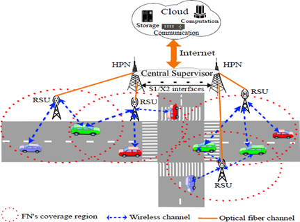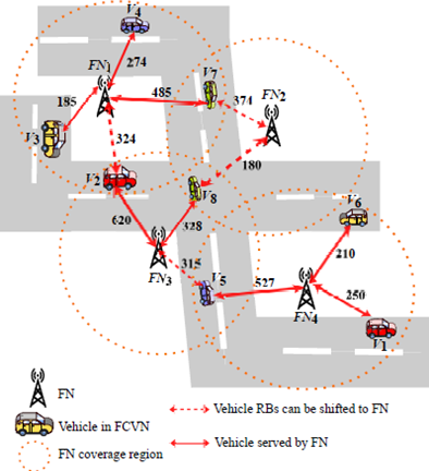 The throughput is maximized by migrating allotted RBs of vehicles in non-restricted coverage regions such that the allotted RBs of these vehicles are minimized among pairs of FNs.