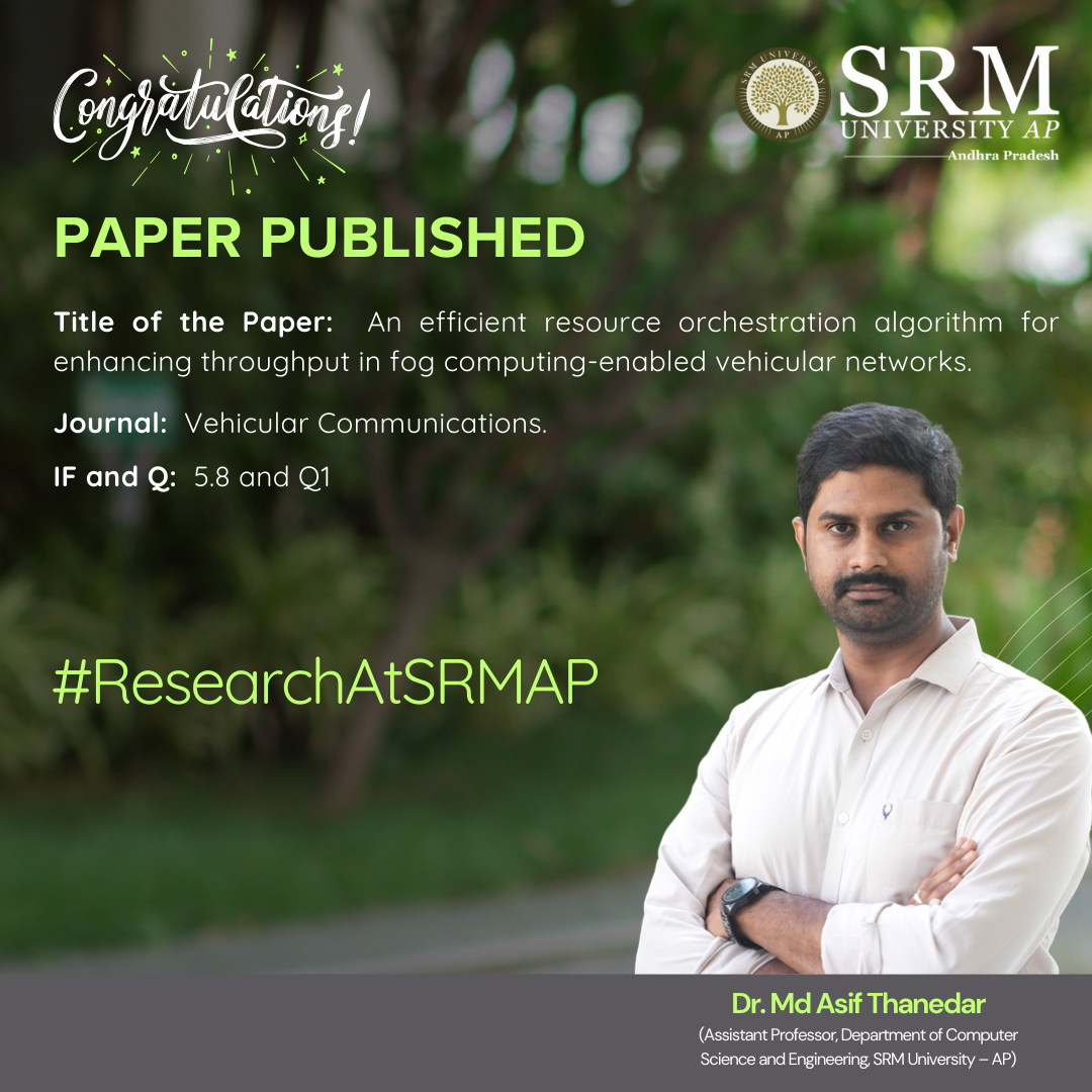 Dr Asif Thanedar, Assitant Professor at the Department of Computer Science and Engineering in research titled “An Efficient Resource Orchestration Algorithm for Enhancing Throughput in Fog Computing-enabled Vehicular Networks,” discusses issues faced by fog nodes (FNs) when serving connected vehicles during busy times. The research introduces an Efficient Resource Orchestration (ERO) algorithm designed to improve network performance by optimising resource use within the limits of FNs. The study aims to make a valuable contribution to the fields of vehicular fog computing and resource management.