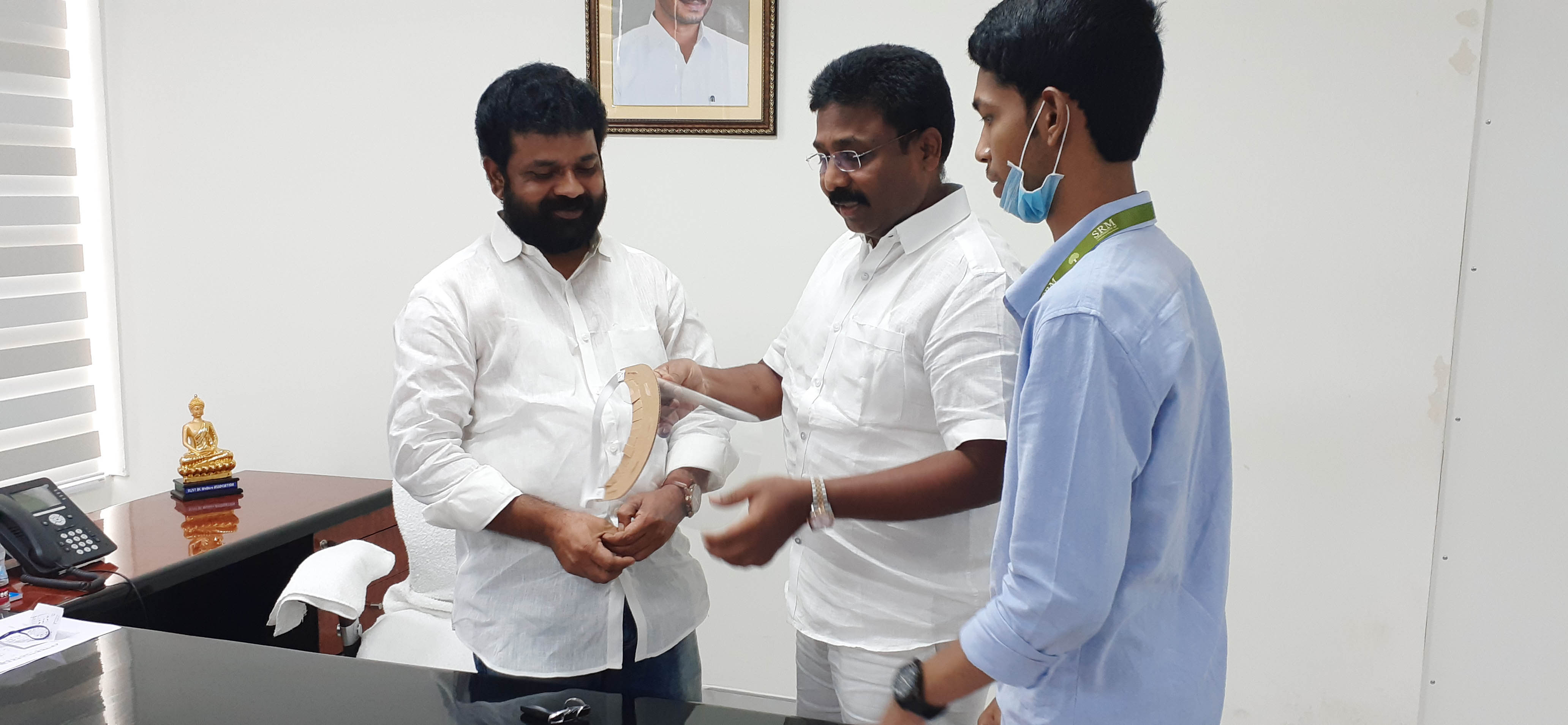 The management of SRM AP, Andhra Pradesh applauds Dr. Jayaprakash on designing the mask after relentlessly working on it for several days. Prof. Narayana Rao, Pro Vice-Chancellor of the University, has written to Adimulapu Suresh, Minister of Education, Andhra Pradesh, and Alla Kalikrishna Srinivas, Deputy Chief Minister of Andhra Pradesh, Minister for Health, Family Welfare and Medical Education, Andhra Pradesh, highlighting the importance of the facial cover and the many ways it can be regarded as a boon to the society as a whole. He said that the Face Shield would be beneficial to millions of students who would be attending regular classes once the educational institutions reopen.