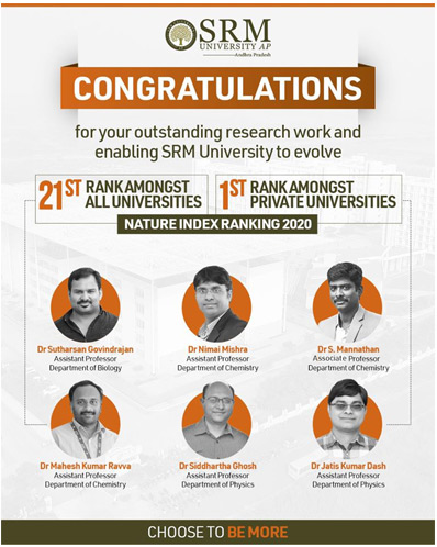 Nineteen research articles were published by the faculty members of SRMIST and its sister institutes between April 1st 2019 and March 31st 2020. These articles were compiled into a database by Nature Research to create the Nature Index rankings. Out of these nineteen articles, twelve were published by the Faculty Members of SRMIST, KTR Campus. One article was published by a faculty member of SRM University – Sikkim. The rest of the six articles were published by faculty members of SRM University- AP, Andhra Pradesh. Dr Sutharsan Govindrajan, Department of Biological Sciences; Dr Nimai Mishra, Dr S. Mannathan, Dr Mahesh Kumar Ravva, Department of Chemistry; Dr Siddhartha Ghosh and Dr Jatis Kumar Dash, Department of Physics played a pivotal role in achieving the honour for SRM University-AP. It is remarkable that SRM-AP, even in its budding stage, has contributed to around one third of the Nature Index score.