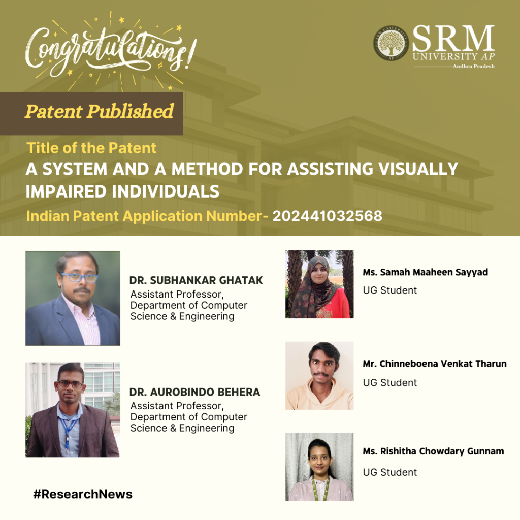 A dedicated team of researchers and professors have developed an innovative patent titled “System and a Method for Assisting Visually Impaired Individuals” that uses cutting-edge technology to significantly improve the navigation experience for visually impaired individuals, fostering greater independence and safety.
