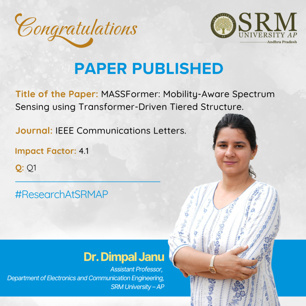 In the digital era, enhancing wireless connectivity is vital for systems’ accurate and efficient functioning. Working on a smart system to catalyse seamless wireless connectivity, Dr Dimpal Janu, Assistant Professor from the Department of Electronics and Communication Engineering, has published a paper “MASSFormer: Mobility-Aware Spectrum Sensing using Transformer-Driven Tiered Structure” in the Q1 journal IEEE Communications Letters. She has developed a novel cooperative spectrum sensing method based on MASSFormer that uses artificial intelligence, specifically a transformer model, to decide when to use a communication channel without causing interference.