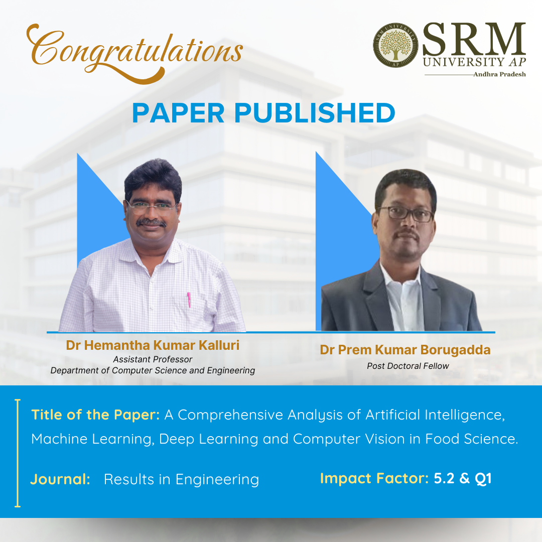 Assistant Professor Dr Hemantha Kumar Kalluri from the Department of Computer Science and Engineering and post-doctoral fellow, Dr Premkumar Borugadda have published a research paper titled, A Comprehensive Analysis of Artificial Intelligence, Machine Learning, Deep Learning and Computer Vision in Food Science. This significant research explores how Artificial Intelligence (AI), Machine Learning (ML), Deep Learning (DL), and Computer Vision (CV) are making food processing smarter and more reliable.