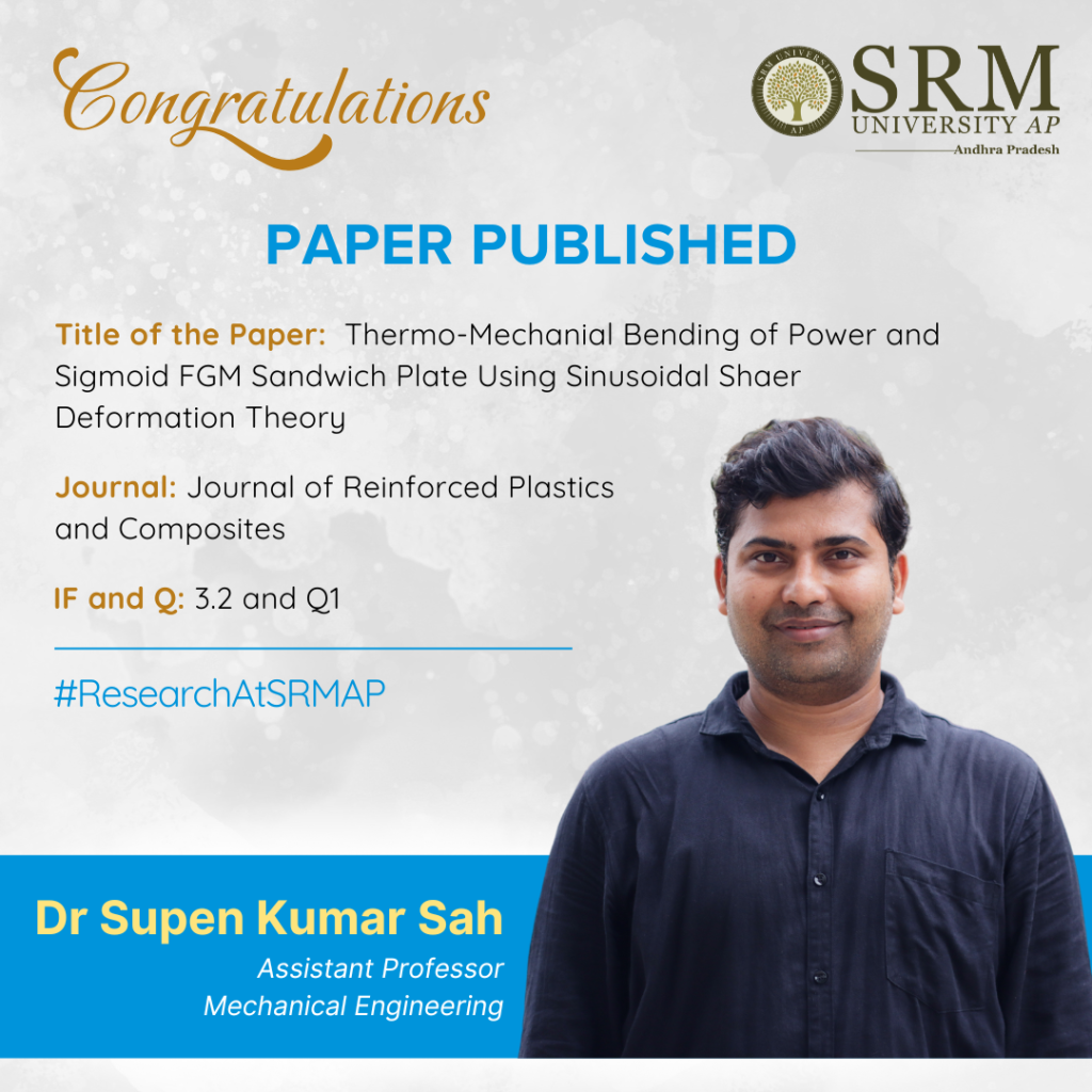 Dr Supen Kumar Sah, Assistant Professor at the Department of Mechanical Engineering presents his exclusive study on the thermo-mechanical bending behaviour of functionally graded material (FGM) sandwich plates using the Sinusoidal Shear Deformation Theory (SSDT) in his recent paper titled “Thermo-mechanical bending of power and sigmoid FGM sandwich plate using sinusoidal shear deformation theory”. The paper has been published in the Journal of Reinforced Plastics and Composites, having an impact factor of 3.2.