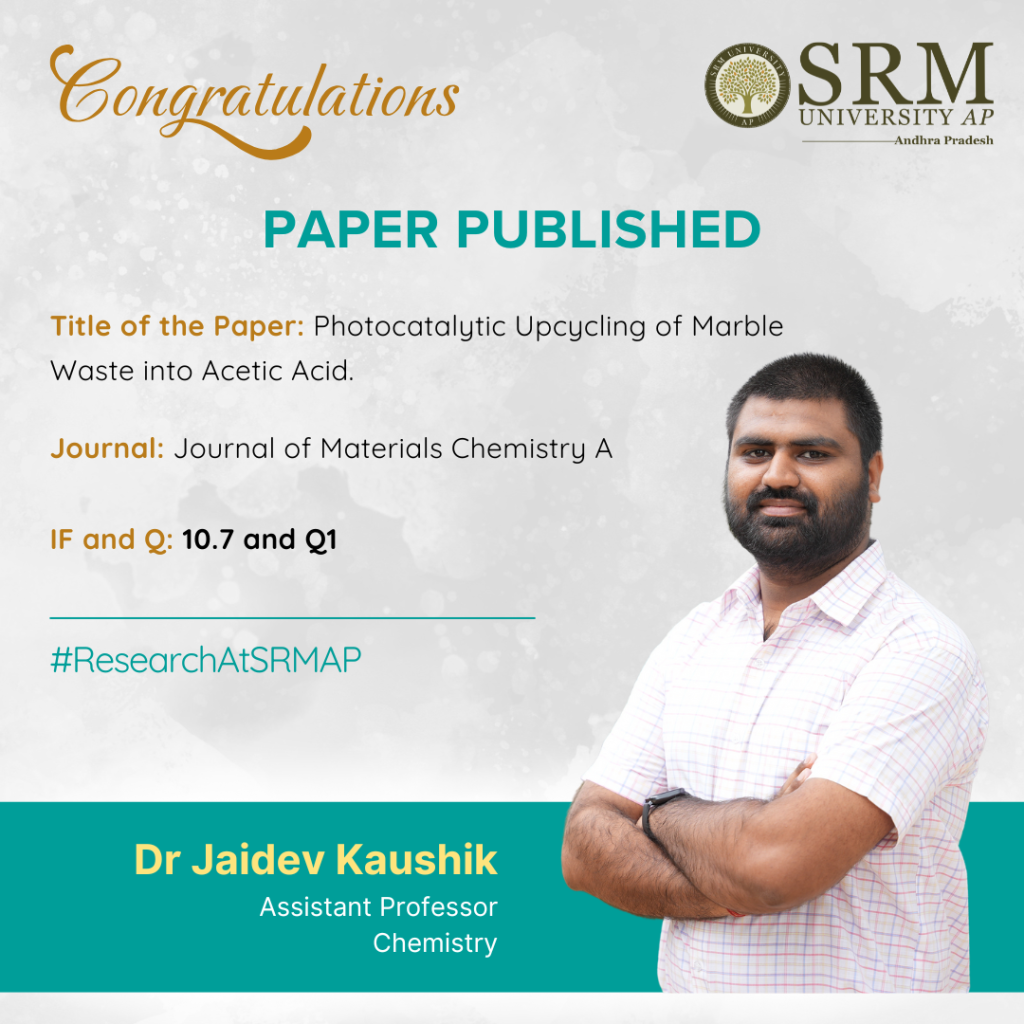 In an attempt to recycle industrial mineral waste into useful products, Dr Jaidev Kaushik from the Department of Chemistry has worked on synthesising copper-based particles that use light to convert carbonate-rich materials like marble dust into acetic acid, a valuable chemical used in industry and fuel production. He has published his research in a paper titled “Photocatalytic Upcycling of Marble Waste into Acetic Acid” in the prestigious Journal of Materials Chemistry A, having an impact factor of 10.7.