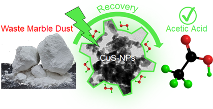 In this study, disk-shaped copper sulfide nanoparticles (CuS-NPs) were synthesised via a simple co-precipitation method and used as a photocatalyst for the reduction of carbonate species derived from marble dust into acetic acid (AcOH), an important industrial and biofuel precursor. The photocatalytic reaction was carried out under monochromatic light (525 nm) in a hydrogen peroxide–water mixture, which served as an electron and radical-rich medium. Key parameters such as solvent composition, light source, catalyst concentration and reaction time were optimised to get the maximum yield of AcOH. The reaction mechanism was investigated using radical scavenging experiments. The practical applicability of the approach was further tested on two additional real-life carbonate waste materials, i.e. chalk dust and scale.
