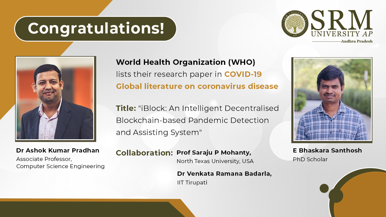 The healthcare system across the globe has been under colossal pressure since the emergence of novel coronavirus pandemic. The pandemic has also unveiled some of the greatest gaps in the existing healthcare systems. The research paper authored by Dr Ashok Kumar Pradhan and his PhD student E Bhaskara Santhosh, Department of Computer Science and Engineering, proposing a blockchain-based pandemic detection model was recognised by WHO and the paper was listed in COVID-19 Global literature on coronavirus disease. The paper titled “iBlock: An Intelligent Decentralised Blockchain-based Pandemic Detection and Assisting System” was published in collaboration with Saraju Mohanty, University of North Texas and Dr Venkata Ramana Badarla, Associate Professor, IIT Tirupati. The authors have expressed their deepest gratitude to Science and Engineering Research Board (SERB) for Grant number TAR/2019/000286 and SRM University-AP for supporting this work.
