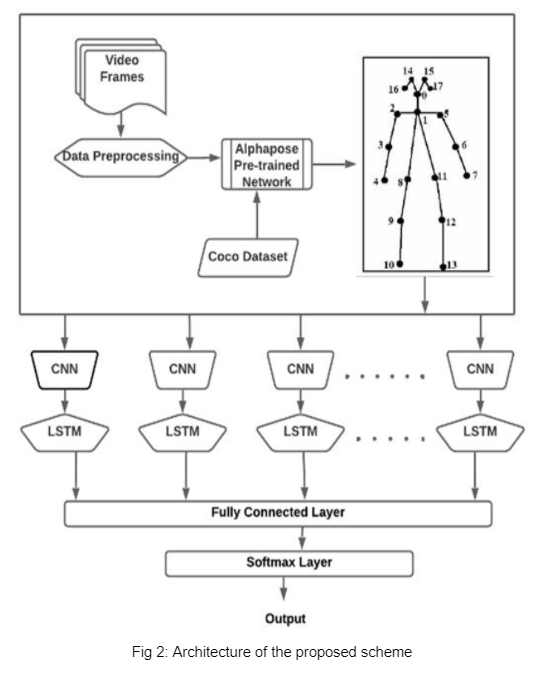 Humans are skilled at visually recognizing and classifying actions in videos, but it’s tough to automate this process. Human action detection in videos is useful in applications like automated surveillance, assisted living, human-computer interaction, content-based video retrieval, and video summarization. The ability to recognize atomic actions like “walking,” “bending,” and “falling” is critical for activity analysis when monitoring elderly people’s daily activities. Our paper presents a new promising solution for fall detection using vision-based approaches. In this approach, we analyse the human joint points which are the prime motion indicators. A set of keypoints of the subject are acquired by applying the AlphaPose pre-trained network. These keypoints are inferred to be the joint points of the subject. The acquired keypoints are processed through a framework of convolutional neural network (CNN) layers. Here, the spatial correlation of the keypoints is analysed. The long-term dependencies are then preserved with the help of long short-term memory (LSTM) architecture. Our system detects five types of falls and six types of daily living activities. We used the UP-FALL detection dataset for validating our fall detection system and achieved commendable results when compared to the state-of-the-art approaches. For comparison, we employed the OpenPose network for keypoint detection. It is inferred from the results that the AlphaPose network is more precise in keypoint detection.