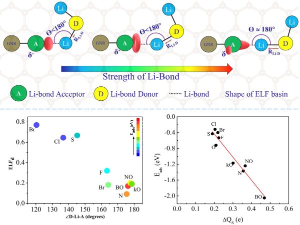 “Using first-principles calculations, we investigate a family of doped graphene nanoribbons (GNRs) for their suitability as cathode hosts in Lithium sulphur batteries. We probe the role played by the lone pairs of the dopants in confining the Lithium polysulfides (LiPS) in order to understand the mechanism of binding. Our results show that the Li-bond between the polysulfides and the doped GNRs is analogous to a hydrogen bond and also dipole-dipole interactions play a key role in anchoring the polysulfides. The charge lost by the sulphur atom of the polysulfide upon adsorption and shape of the lone pair basins and the value of ELF at the dopant position can provide a quick estimate of the strength of the bond. Significant contractions in the ELF profiles are also observed upon Li 2 S adsorption, further providing evidence for the H bond like nature of the Li-bond. Our results corroborate the fact that all acceptors suitable for hydrogen bond can be employed as suitable dopants for carbon-based cathode hosts in Li-S batteries.”