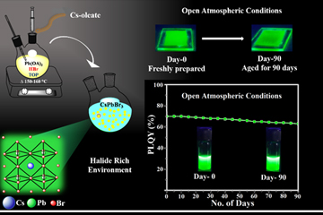Dr Mishra and his research group extensively studied the various Cs-Pb-Br molar ratio and found an optimum condition that was able to stabilize with high PLQY CsPbBr3 NCs. These completely amine-free CsPbBr3 perovskite NCs synthesized using bromine-rich condition, exhibit good stability and durability for more than three months in the form of colloidal solutions and films respectively. Furthermore, they demonstrated stable tunable emission across a wide spectral range, via anion exchange process. More significantly, their work presents an open atmospheric stable CsPbBr3 NCs films demonstrating high photoluminescence (PL), which can be further used for optoelectronic device applications.