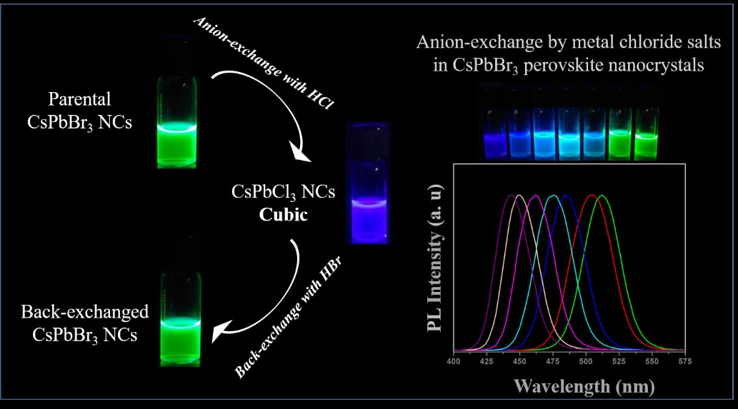 Cesium-lead-halide perovskite nanocrystals In the research work, Dr. Mishra’s group has developed a very simple facile synthesis process of perovskite nanocrystals with very high emissive properties and colour tunability. Colloidal caesium-lead-halide perovskite nanocrystals (NCs) (CsPbX3, X = Cl, Br, I) are presently on-demand because of their excellent photoluminescence quantum yield (PLQY), wide range of band gap tunability and defect tolerance, finding its application as photodetectors, light-emitting diodes (LEDs), asing, and photovoltaics. Dr. Mishra informs, “Anion ( the halides) exchange in colloidal caesium-lead- halide perovskite nanocrystals (NCs) is a highly efficient protocol to tune their chemical composition and optoelectronic properties. In this work, we first report the use of hydrohalic acids (HX; X=Cl and Br) as a precursor for anion exchange which can be an efficient way to control the composition and optical properties of CsPbBr3 perovskite nanocrystals (NCs).” Furthermore, the team demonstrated a facile and efficient approach of anion-exchange which is implemented to tune the optical properties of CsPbX3 perovskite NCs via a simple post-synthetic modification with hydrohalic acids. Importantly, this work presents a simple, feasible, reproducible synthetic route toward control halide exchange in metal halide perovskite NCs with various optoelectronic properties.