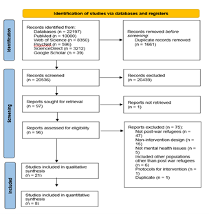Psychological interventions involving both in-person and telehealth showed effectiveness for mental health problems among war-refugees. Policy makers and intervention developers should provide keen attention while designing interventions for mental health issues of war refugees as their challenges are distinct from other refugees and the general population. Further, the government and healthcare authorities can aim for adopting hybrid models integrating both telehealth and in-person interventions for the effective management of mental health problems of war refugees.