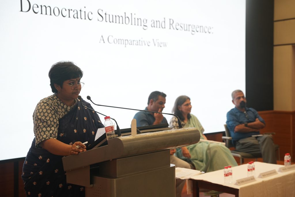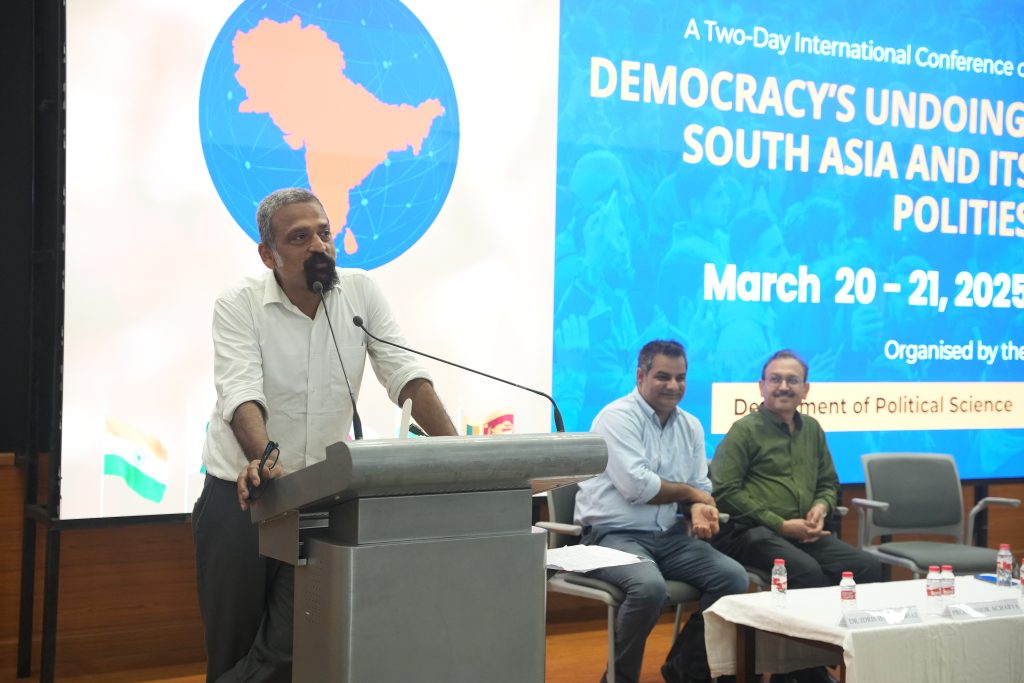 Prof. Vishnupad, Dean – Easwari School of Liberal Arts set the tone for the conference in his welcome address. He deliberated on various aspects of democracy and shared the vision behind Easwari School of Liberal Arts, now home to seven vibrant departments, each oriented towards the holistic growth of its students— intellectual, emotional, and ethical. Dr Idris Hassan Bhat, Assistant Professor of the Department of Political Science and the convener of the conference, addressed the resilience of democratic ideals in South Asian nations.