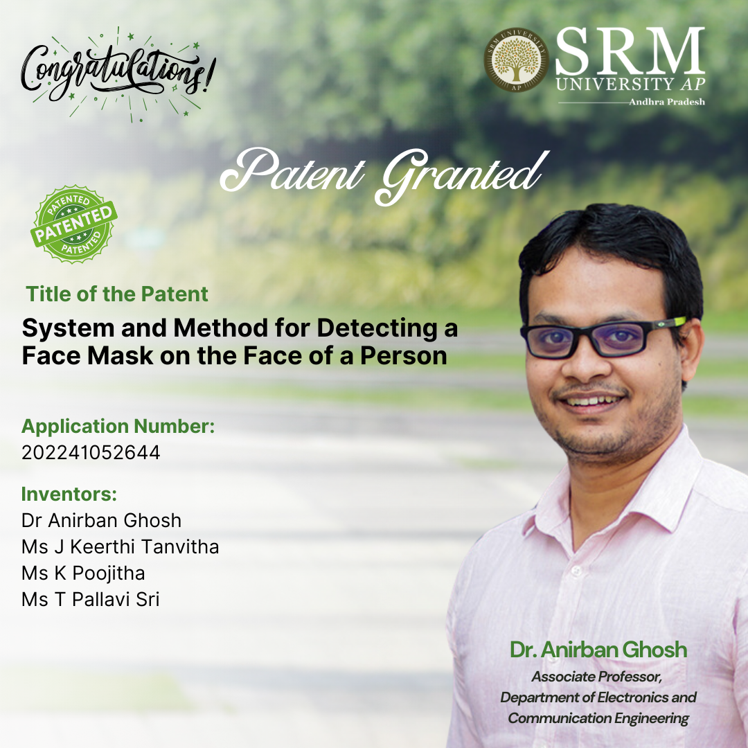 The patent titled, System and Method for Detecting a Face Mask on the Face of a Person with application number: 562697 by Assistant Professor, Dr Anirban Ghosh and his students from the department Ms J Keerthi Tanvitha, Ms K Poojitha, Ms T Pallavi Sri, has come up with a novel idea that focuses on developing a system and method for detecting face masks on individuals before they enter a gated space. Their research uses image capture, face detection, mask-wearing verification, and temperature sensing to ensure compliance with health and safety protocols.