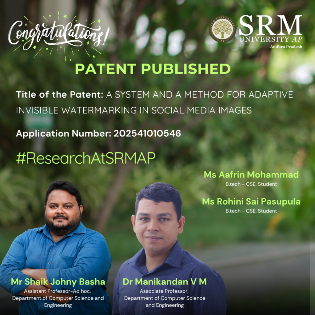 Professors, Dr Manikandan V M and Mr Shaik Johny Basha from the Department of Computer Science and Engineering along with their B.Tech. students Ms Aafrin Mohammad and Ms Rohini Sai Pasupula have published the patent titled, “A System And A Method For Adaptive Invisible Watermarking In Social Media Images.” Their patent introduces a novel method for securing photo downloads, ensuring that any unauthorised use of the images can be traced back to its original source if tampered with.