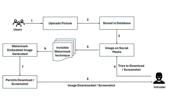 In today’s digital world, people frequently share personal photos on social media, but there is very little protection against unauthorized downloads or screenshots. Once an image is copied, there is no way to track who took it or where it is being used. Through their invention, the team solves this problem by embedding a hidden watermark in images without changing how they look. This hidden watermark automatically adds invisible information such as the IP address, location, date, and time of the user who downloads or screenshots the image. This means that if the image is misused or shared without permission, it can be traced back to the source. By combining image editing techniques, encryption, and digital security, they ensure that people’s photos remain safe and trackable online. Hence, the invention provides a new way to protect privacy and copyright while allowing users to engage freely on social media.