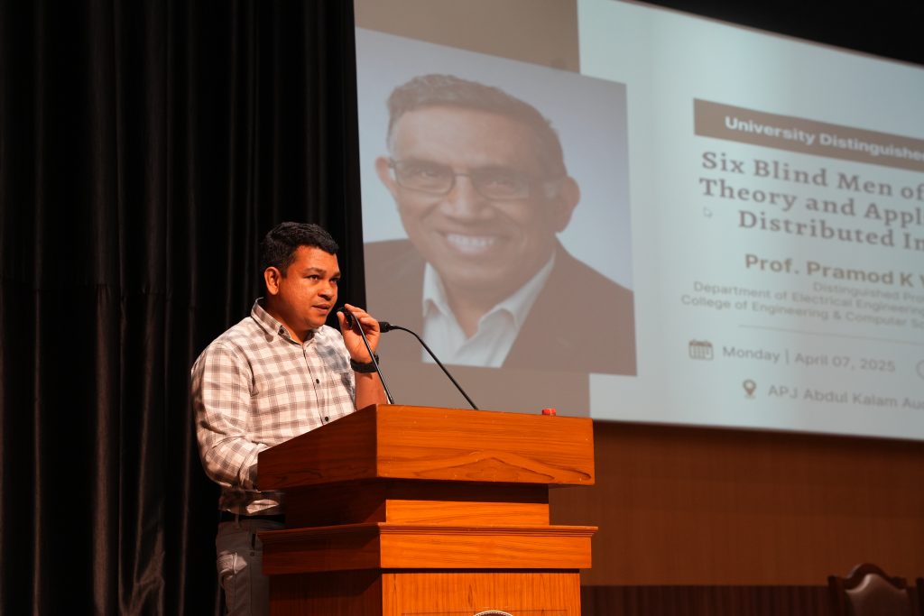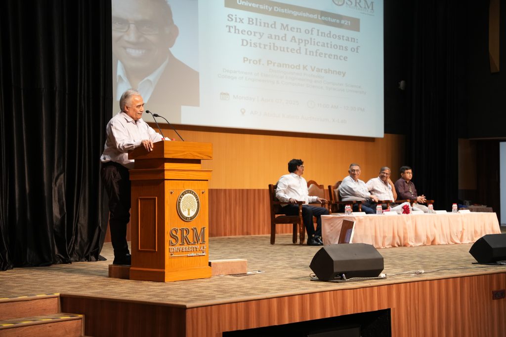 SRM University-AP hosted the 21st edition of its University Distinguished Lecture (UDL #21). The coveted event saw the presence of the distinguished speaker Prof. Pramod K Varshney from the Department of Electrical Engineering and Computer Science, College of Engineering and Computer Science, Syracuse University, New York. The title of UDL 21, “Six Blind Men of Indostan: Theory and Application of Distributed Inference” elaborated on the use of sensors to collect data and its application in the areas of Security, Surveillance, Disease Detection, Military services and so on.