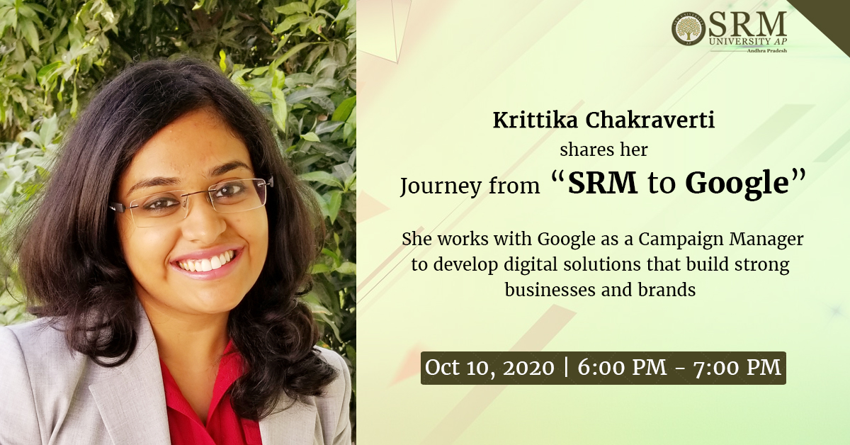Ms Krittika will be joining you today, October 10, 2020, to share her journey from being a freshman at SRMIST to being transformed into a Professional with support and guidance from her teachers and mentors. Do log in at 6 o’clock in the evening to be a part of the energetic session with Ms Krittika.
