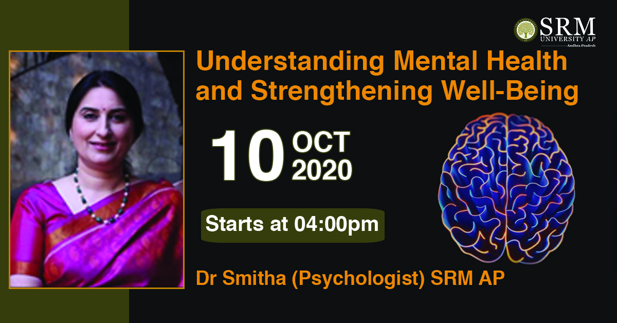 Department of Student Affairs, SRM University-AP, Andhra Pradesh has requested Dr Smita Sharma, Student Counselor, SRM AP, to deliver a session on ‘Understanding Mental Health and Strengthening Well-Being’ on “World Mental Health Day” – October 10, 2020, at 4 p.m. The widespread perception of mental illness is associated with stigma, largely due to lack of awareness. Also, not addressing the mental health issues may lead to anxiety disorders, and mood disorders. Dr Smita will take the audience through the lecture session, which would enable the students to help themselves and the people around them to overcome the overwhelming situation.