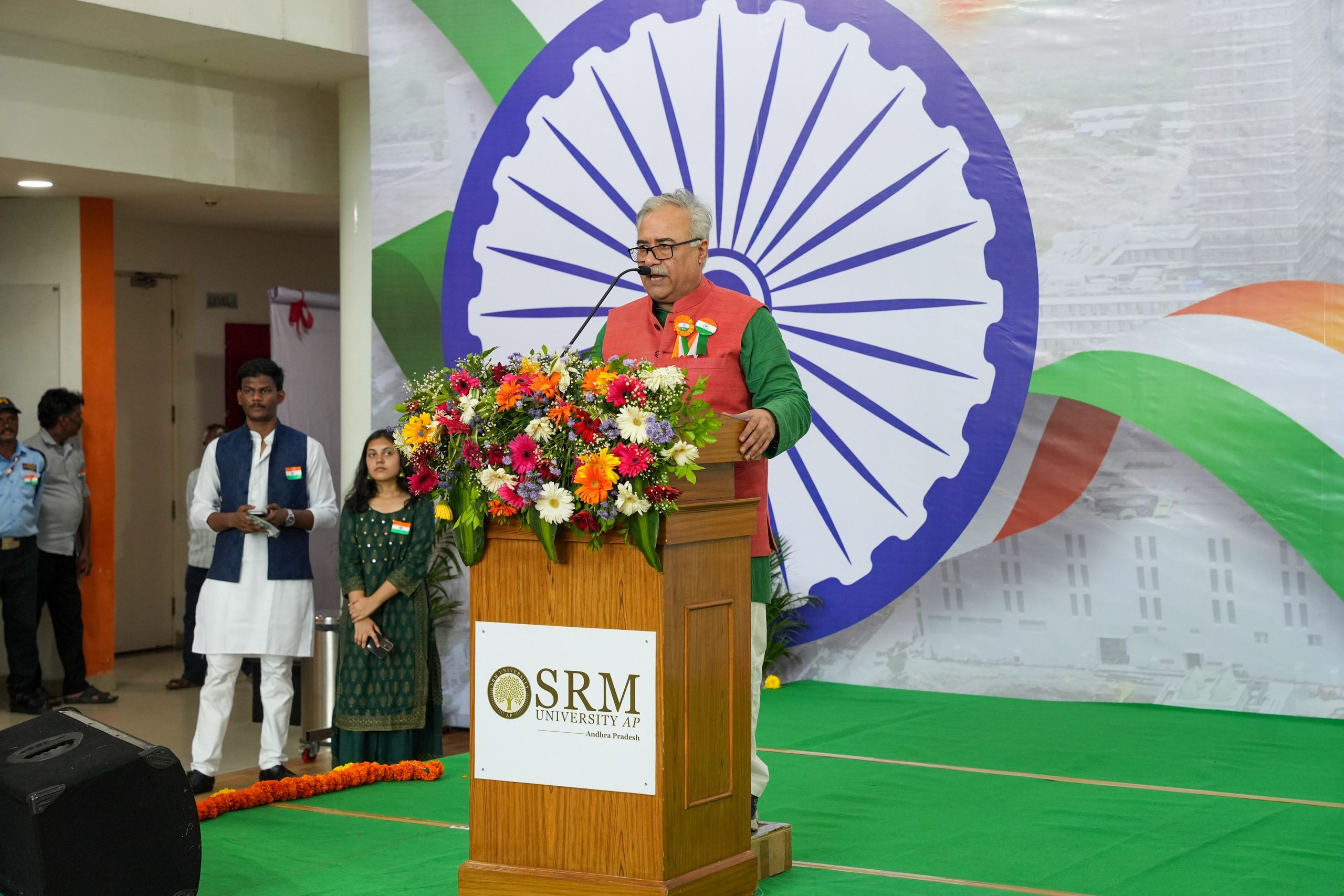 In his speech, Prof. Arora recalled the various triumphs and advancements that India has attained till now. He addressed the different important qualities a student needs to have to succeed and further proved how these qualities are imparted in SRM University-AP through its curriculum, course plans, and innovative pedagogy. He also called attention to the support of the maintenance staff, security, housekeeping personnel, and construction workers, without whom the stellar progress of the University couldn’t have been possible.