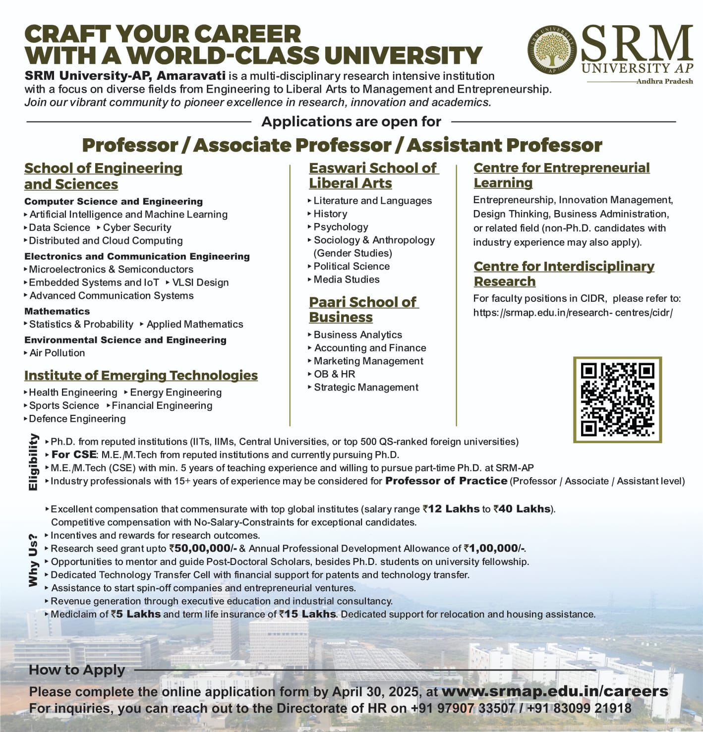 SRM University-AP is recognised as one of the most preferred universities to work in the country. We hire passionate individuals and provide them with a happening and invigorating workspace to learn from colleagues, peers, and leaders across the varsity.