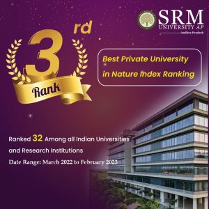 SRM University-AP has been ranked 3rd among all the private universities in India for the second consecutive time in the recently announced Nature Index Ranking. With 13 quality research publications, the university stood on top of the chart from March 2022 to February 2023. The six-year-old multidisciplinary research-intensive university has climbed up 13 spots, ranking 32nd among all reputed Indian universities, institutes of national importance and research institutions in India.