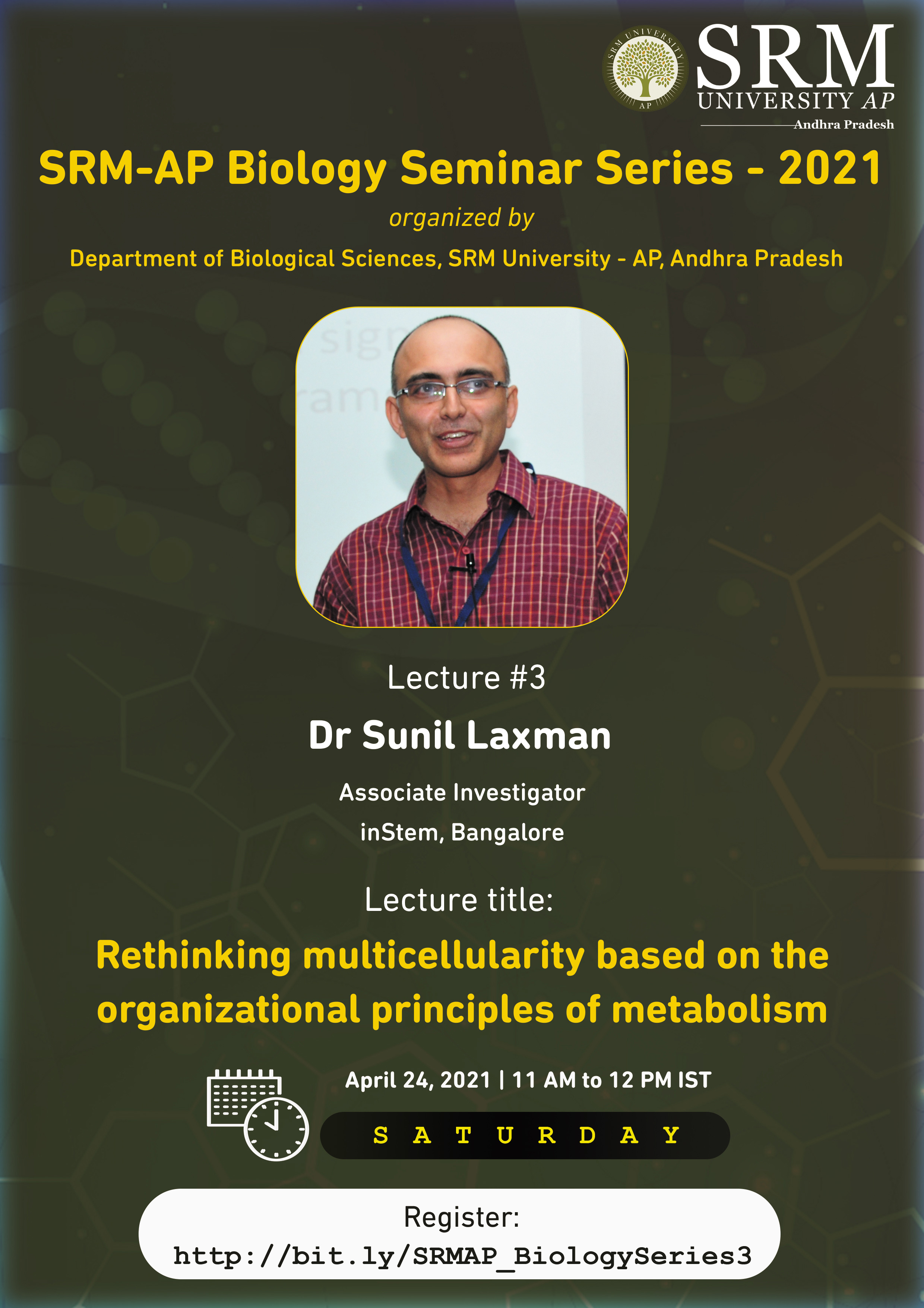 In the next chapter of the Biology Seminar Series, the Department of Biological Sciences, SRM University-AP, invites Dr Sunil Laxman to deliver an enlightening talk on “Rethinking multicellularity based on the organizational principles of metabolism”. Biology Seminar Series 03 has been scheduled for April 24, 2021, at 11.00 am.