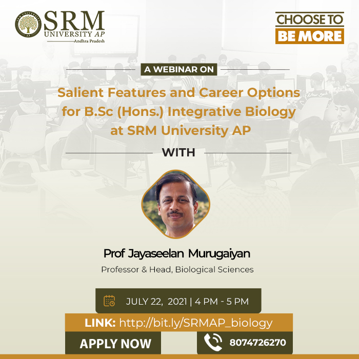 SRM University-AP has begun a series of Webinars to introduce its departments and courses to aspiring applicants of the undergraduate degree programmes. Different departments are presenting interactive sessions to provide an overview of their respective courses and additional resources that SRM University-AP students have access to during their academic years. The Department of Biological Sciences hosts a similar seminar to enlighten enthusiastic students with an overview of the BSc (Hons) in Integrative Biology and the career options associated with it. Prof Jayaseelan Murugaiyan, Head of the Department of Biological Sciences, will educate the audience with an in-depth discussion on the subject and why it will be beneficial to pursue the BSc in Integrative Biology from SRM University-AP. The session is on July 22, 2021, at 4:00 p.m.
