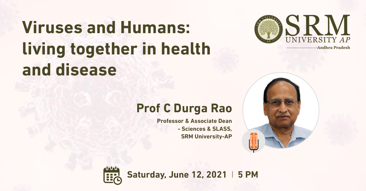 An online panel discussion on the topic “Viruses and Humans: living together in health and disease” will be held on June 12, 2021, at 5.00 pm, under the auspices of SRM University-AP, Andhra Pradesh. Prof C Durga Rao, a leading scientist in the field of Virology in India, will chair the session and elucidate on the history of humans and viruses being cohabitants. He is also the Associate Dean-Sciences, and School of Liberal Arts and Social Sciences (SLASS), SRM University-AP.