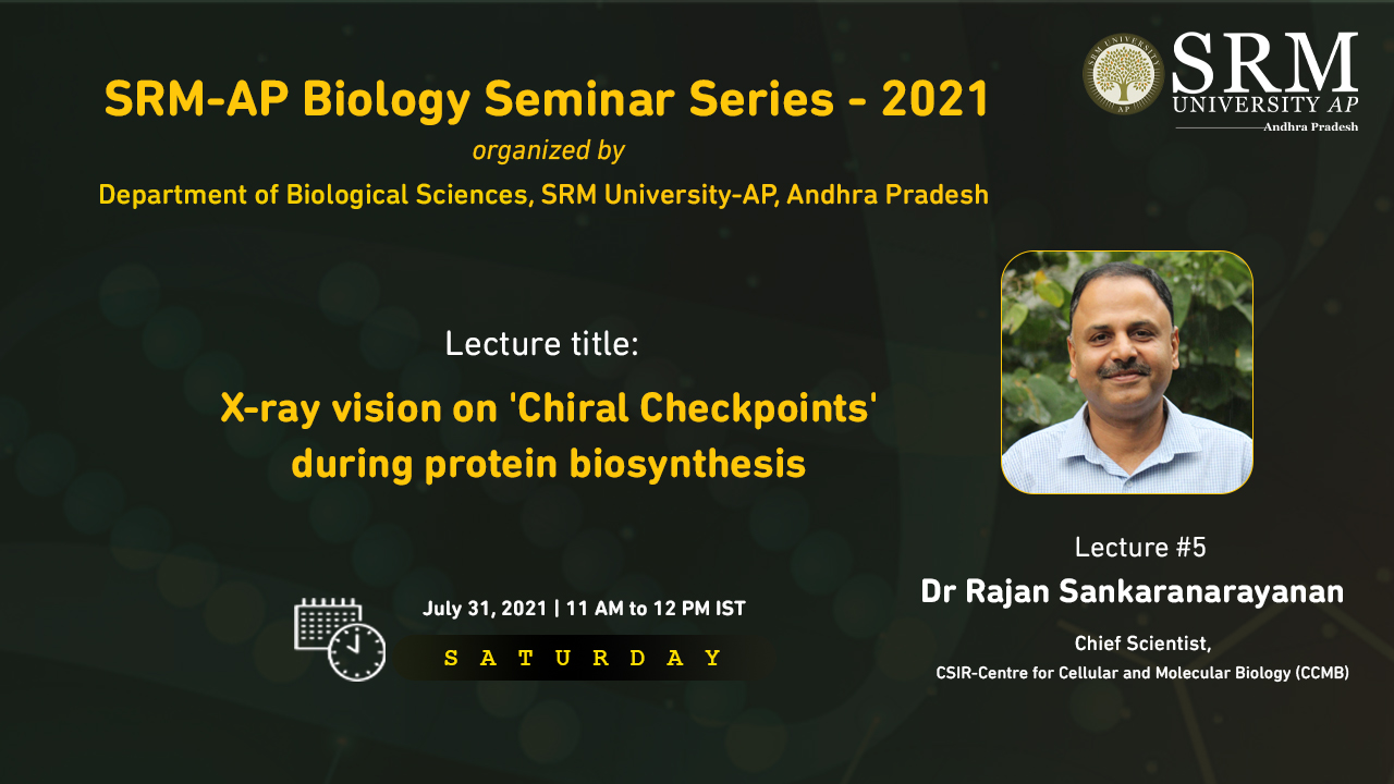 The latest episode of the webinar series conducted by the Department of Biological Sciences in SRM University-AP is scheduled for July 31, 2021, at 11.00 am. Dr Rajan Sankaranarayanan, Chief Scientist at CSIR-Centre for Cellular and Molecular Biology (CCMB) will give a lecture on the topic “X-ray vision on ‘Chiral Checkpoints’ during protein biosynthesis” in the session. Faculty and research scholars from the department will join the speaker on the panel.