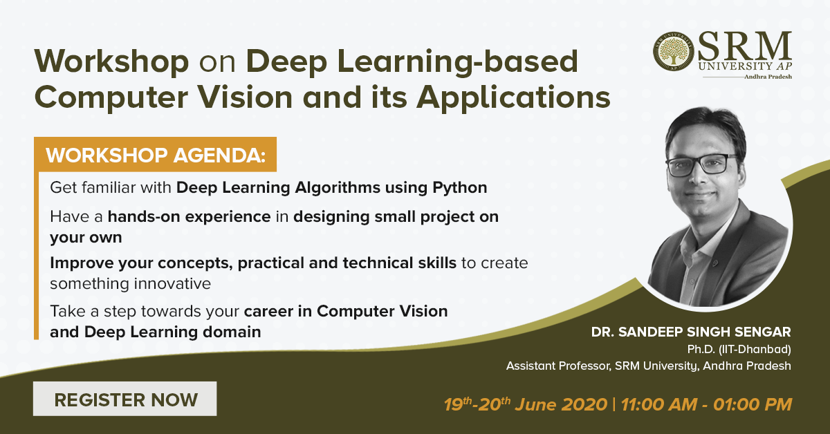 Dr Sandeep Singh Sengar, Assistant Professor, Department of Computer Science and Engineering, is organising a workshop for the enthusiasts on “Deep Learning-based Computer Vision and its Applications” on 19th and 20th June 2020 at 11 a.m. onwards.