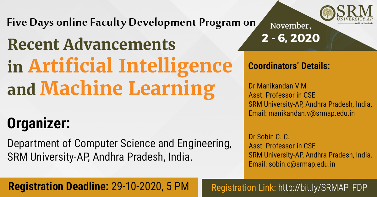Department of Computer Science and Engineering, SRM University-AP, Andhra Pradesh is orchestrating a five-day online Faculty Development Programme (FDP) on “Recent Advancements in Machine Learning and Artificial Intelligence” from November 2, 2020, till November 6, 2020. The programme will be split into two sessions, where the first session will be held from 9.30 AM to 11 AM, and the second session will commence at 11.30 AM and end at 1 PM. During the FDP, Resource persons will be sharing knowledge during the morning sessions of the FDP to inspire, and mentor the faculty. Among the venerated speakers, Prof Dipti Prasad Mukharjee, Professor, Electronics and Communication Sciences Unit, ISI Kolkata, India will be delivering a lecture on “Machine Learning Techniques for Computer Vision”. Further, Dr V Masilamani, Associate Professor, Computer Engineering, Indian Institute of Information Technology Design and Manufacturing (IIITDM) Kancheepuram, Tamil Nadu, India, will be sharing insights on “Machine Learning for Image Quality Assessment”.