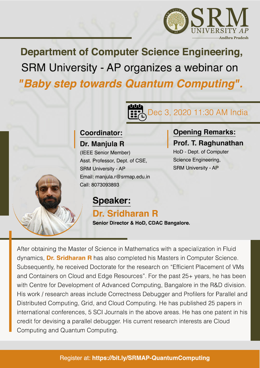 Department of Computer Science invites Dr Sridharan R to share insights on “Baby steps towards Quantum Computing”