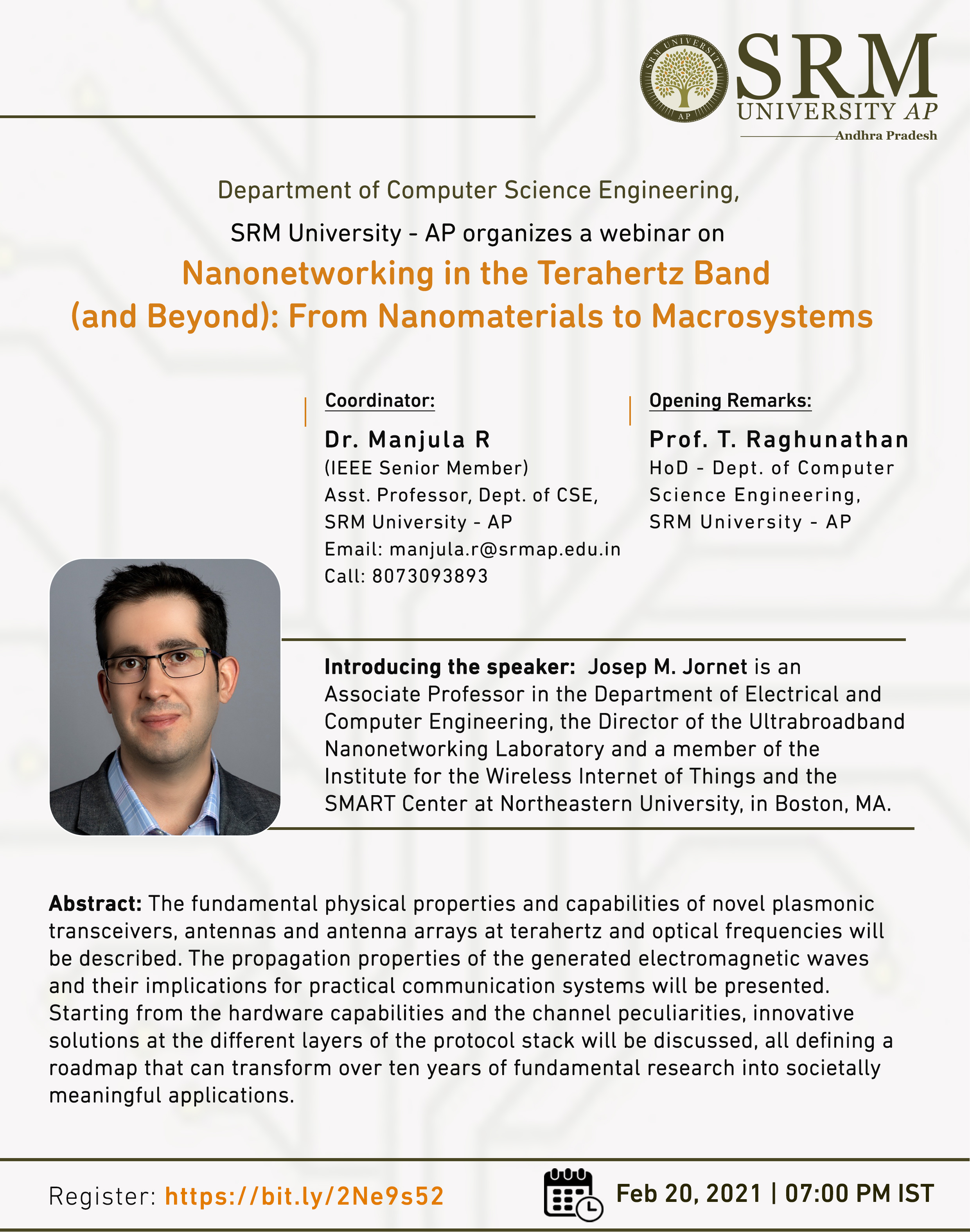 Department of Computer Science and Engineering organises a webinar on “Nanonetworking in the Terahertz Band (and Beyond): From Nanomaterials to Macrosystems” on February 20, 2021, at 7:00 PM IST. Dr Josep M Jornet, Associate Professor, Department of Electrical and Computer Engineering, Northeastern University, USA, is the distinguished speaker for the webinar.