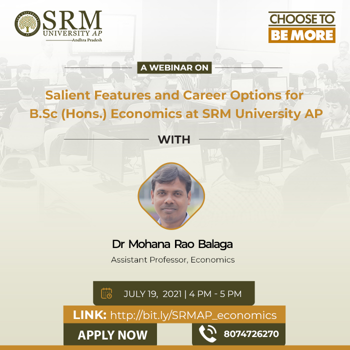 The Department of Economics is hosting a webinar on “Salient Features and Career Opportunities for BSc (Hons) Economics at SRM University AP” on July 19, 2021, at 4.00 pm to discuss the thrust areas of Economics. Dr Balaga Mohana Rao, Assistant Professor in the department, will introduce students to the theoretical and analytical foundations of economics careers.