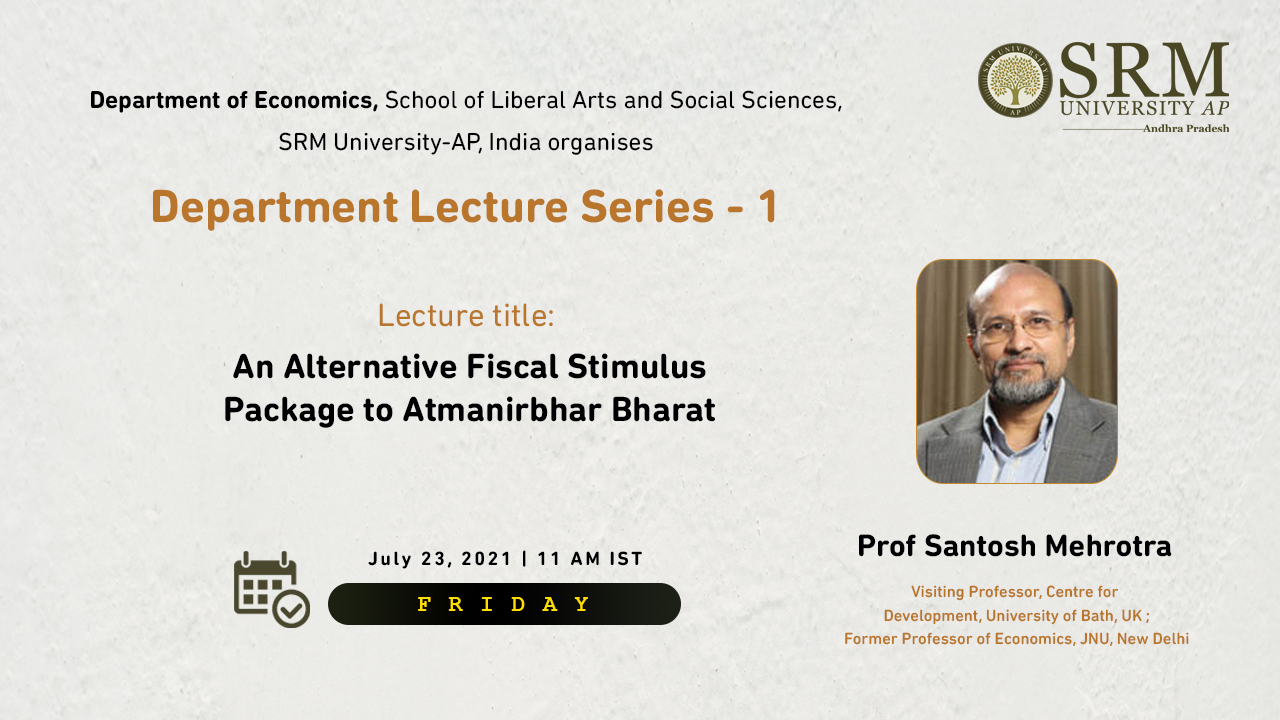 When the fiscal measures announced by the Central Government remain as textbook prescriptions, the scholars of our nation work for bettering the ground reality of India. The Department of Economics at SRM University-AP, in the first session of the Departmental Lecture Series, is conducting an online lecture titled “An Alternative Fiscal Stimulus Package to Atmanirbhar Bharat” on July 23, 2021, at 11.00 am to enunciate a novel perspective for fiscal stimulus packages.