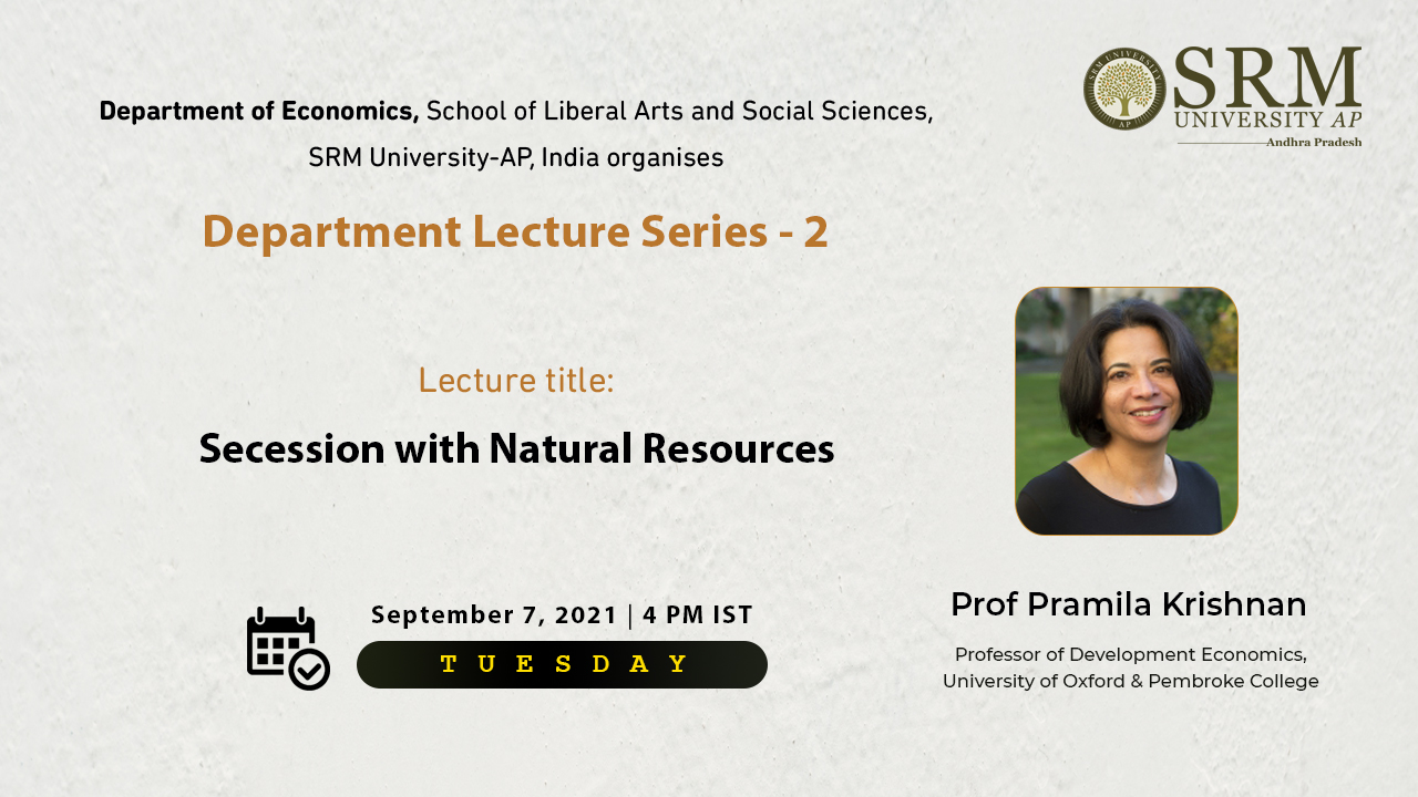 The second episode of the lecture series organised by the Department of Economics, SRM University-AP, will be held on September 07, 2021, at 04.00 pm. The lecture titled “Secession with natural resources” will be delivered by Prof Pramila Krishnan from the Oxford Department of International Development.
