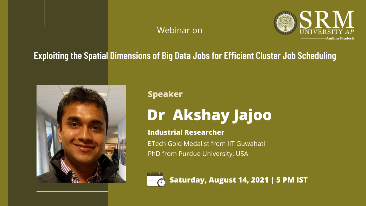 The Departments of Electrical and Electronics Engineering (EEE) and Computer Science and Engineering (CSE) jointly present a technical talk on “Exploiting the Spatial Dimensions of Big Data Jobs for Efficient Cluster Job Scheduling” on August 14, 2021, Saturday, at 5:00 pm (IST). Dr Akshay Jajoo, industrial researcher, will enlighten the students and researchers on his PhD thesis which focuses on developing novel learning and scheduling algorithms for distributed jobs in clouds.