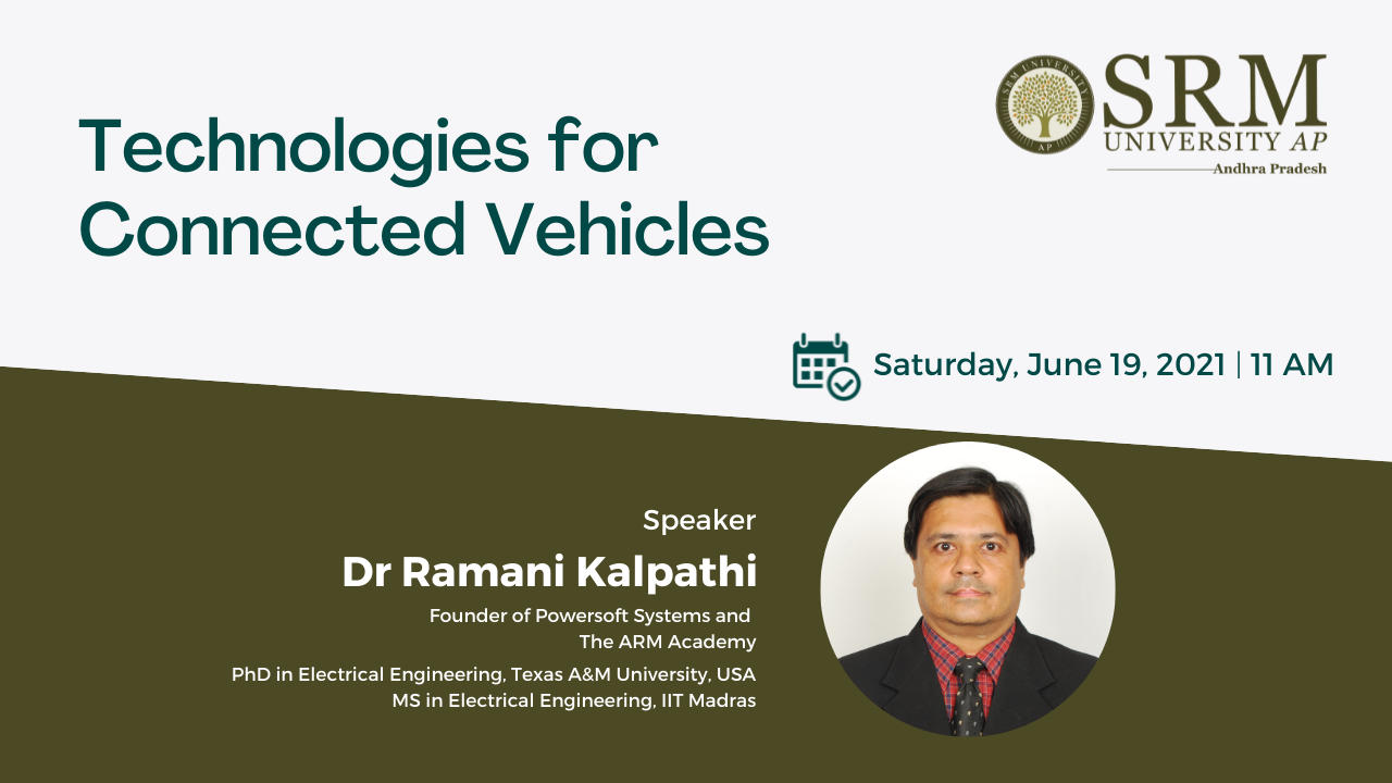 An invited lecture, “Technologies for Connected Vehicles”, will be organised by the Department of Electrical and Electronics Engineering (EEE), SRM University-AP, Andhra Pradesh, on June 19, 2021, at 11.00 am. In this online session, Dr Ramani Kalpathi, guest faculty at BITS Pilani, will give an introduction to intravehicle networks with a focus on CAN, LIN, Flexray, MOST, Ethernet, and Bluetooth networks introducing the frame formats, sample hardware implementation, and SAE formats.