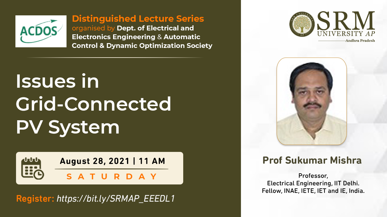 The Department of Electrical and Electronics Engineering (EEE) at SRM University-AP is organising an invited lecture in collaboration with the technical society Automatic Control & Dynamic Optimization Society (ACDOS) on August 28, 2021. Prof. Sukumar Mishra from IIT Delhi will speak on the topic of “Issues in grid-connected PV system” at 11.00 am on that day via zoom. Vice-Chancellor of SRM University-AP Prof Vajja Sambasiva Rao, Associate Deans and Faculty members of the EEE department will be the panellists of the event.