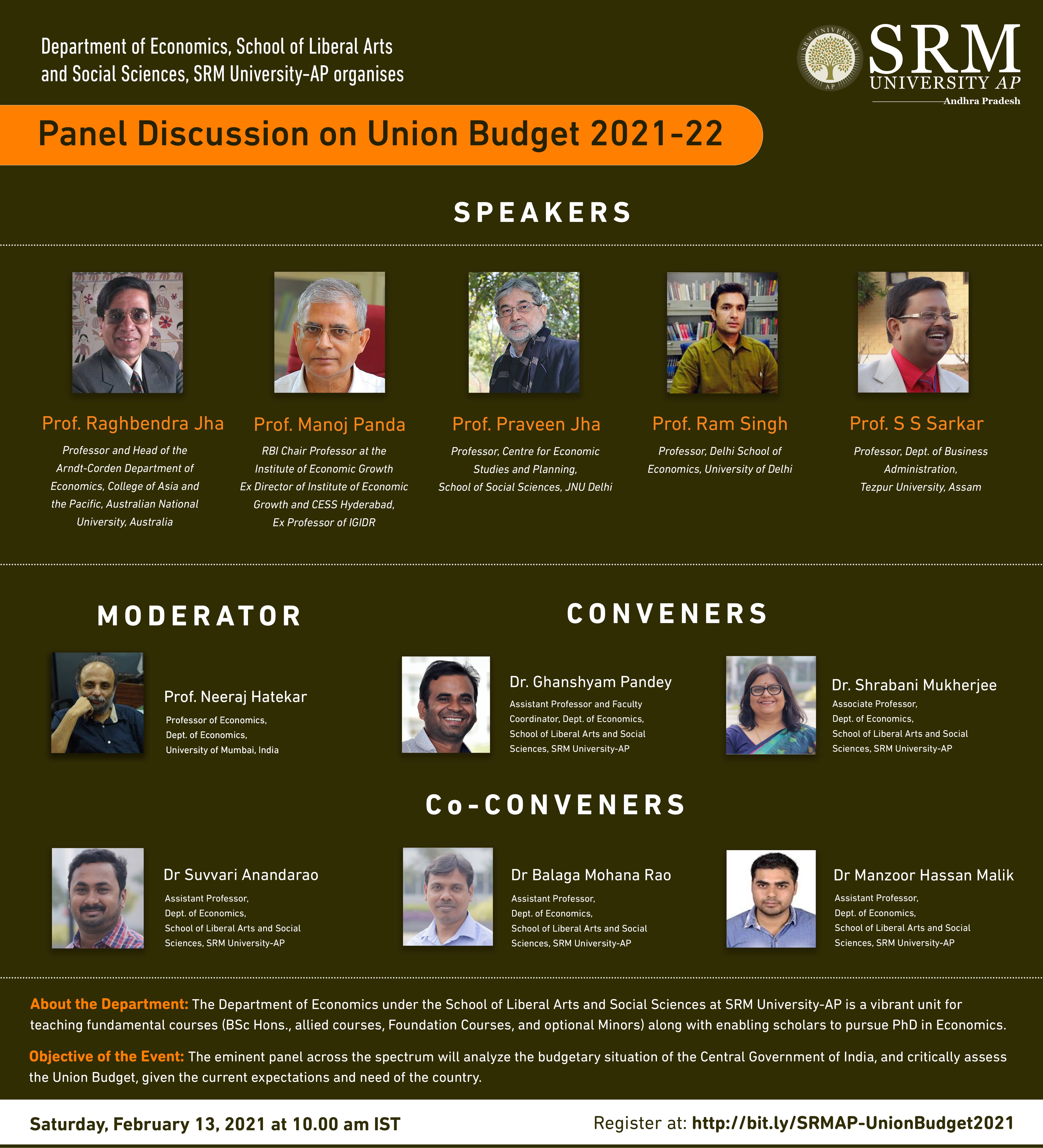 Objective of the Event: The world is facing a severe pandemic driven crisis and India is not an exception. Academics, Industry and the public are eagerly waiting for the revival of the economy. We cannot ignore the role of government. India needs a robust budget which will boost the demand and stabilize the economy. This panel discussion will analyse the announced budgetary sectoral fund allocation and revenue design of GoI. In order to tap the potential revenue sources to cope up with the adverse impact of pandemic, whether budget has been delivered on expected lines. The objective of the event is to place a platform for better understanding about the budgetary situation of the Central Govt. and critical analysis of the Union Budget by the eminent academicians across the spectrum, given the current expectations and need of the country.