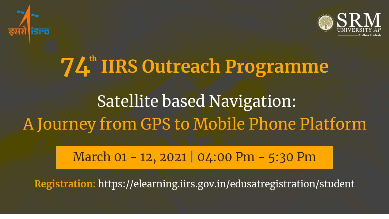 SRM University-AP, Andhra Pradesh has collaborated with the Indian Institute of Remote Sensing (IIRS) -Indian Space Research Organization (ISRO)’s outreach programme, enabling the students of SRM University-AP to avail the 74th IIRS outreach programme titled “Satellite based Navigation: A Journey from GPS to Mobile Phone Platform” sponsored by the Indian Space Research Organisation, Department of Space, Government of India. This programme is scheduled for March 1-12, 2021 and will be held from 4 PM till 5.30 PM.