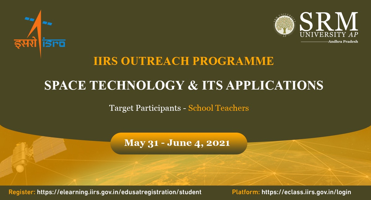 IIRS outreach programme is an innovative distance learning initiative for training the students and professionals from academic Institutions and user departments in the field of geospatial technology & Earth Observation (EO) by utilising state-of-art Information and communication technologies. SRM University AP-Andhra Pradesh has collaborated with the Indian Institute of Remote Sensing (IIRS) -Indian Space Research Organization (ISRO) ‘s outreach programmes. As part of the association, SRM University-AP being the nodal centre for such programmes, the people of SRM University-AP have the excellent opportunity to register for courses as well as live and interactive programmes being organised by IIRS. In addition, E-learning courses for a short span of 3-4 Month duration will be accessible by the students.