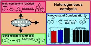 In this work, he reported the synthesis and application of a Zn-Bp-BTC MOF (Bp – 4,4′-bipyridine; BTC – 1,3,5-benzene tricarboxylic acid; MOF – metal organic framework) as a heterogeneous catalyst for mediating organic reactions. Initial reaction conditions were optimized for the Knoevenagel condensation reaction using Zn-Bp-BTC as a heterogeneous catalyst. Various factors such as the effect of solvent, temperature and catalyst loading were evaluated. Although the reaction proceeded at room temperature using methanol as the solvent, 60 °C offered the best yield in a shorter duration. Under optimized reaction conditions, a wide range of α,β-unsaturated dicyano compounds were prepared from the corresponding carbonyl precursor and malononitrile, the active methylene counterpart. A systematic investigation was also carried out to assess the role of the ligand and metal salt in the Knoevenagel condensation reaction. It was found that the Zn-Bp-BTC MOF catalyzed the reaction efficiently in comparison to its analogue Zn-BTC MOF and precursor Zn(NO 3 ) 2 ·6H 2 O. Finally, catalytic recycling and stability studies showed that the catalyst is able to mediate the reaction for up to five consecutive cycles without undergoing any significant chemical or morphological changes. Further, the catalyst was tested for its efficacy in a multicomponent reaction (MCR). An MCR with the Zn-Bp-BTC MOF as the catalyst afforded good yields and there was no reaction in the absence of the catalyst. Similarly, the catalyst was tested for its efficiency in benzimidazole synthesis.