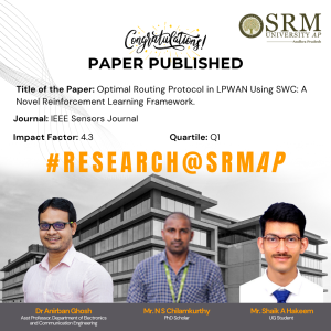In a significant academic achievement, Dr Anirban Ghosh, Assistant Professor from the Department of Electronics and Communication Engineering along with Mr Naga Srinivasarao Chilamkurthy, PhD Scholar, and Mr Shaik Abdul Hakeem, an undergraduate student, have made a remarkable contribution to the field of communication engineering. Their paper, titled “Optimal Routing Protocol in LPWAN Using SWC: A Novel Reinforcement Learning Framework,” has been published in the esteemed IEEE Sensors Journal, with an impressive impact factor of 4.3.