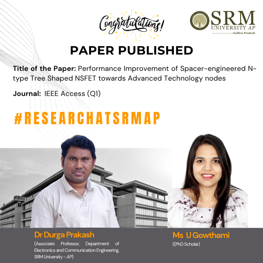 Dr M Durga Prakash, Assistant Professor in the Department of Electronics and Communication Engineering, and his PhD scholar, Ms U Gowthami, have published a research paper titled “Performance Improvement of Spacer-engineered N-type Tree Shaped NSFET towards Advanced Technology nodes” in the Q1 journal, IEEE Access. The paper has an impact factor of 3.9 and will pave the way for significant advancements in the field.